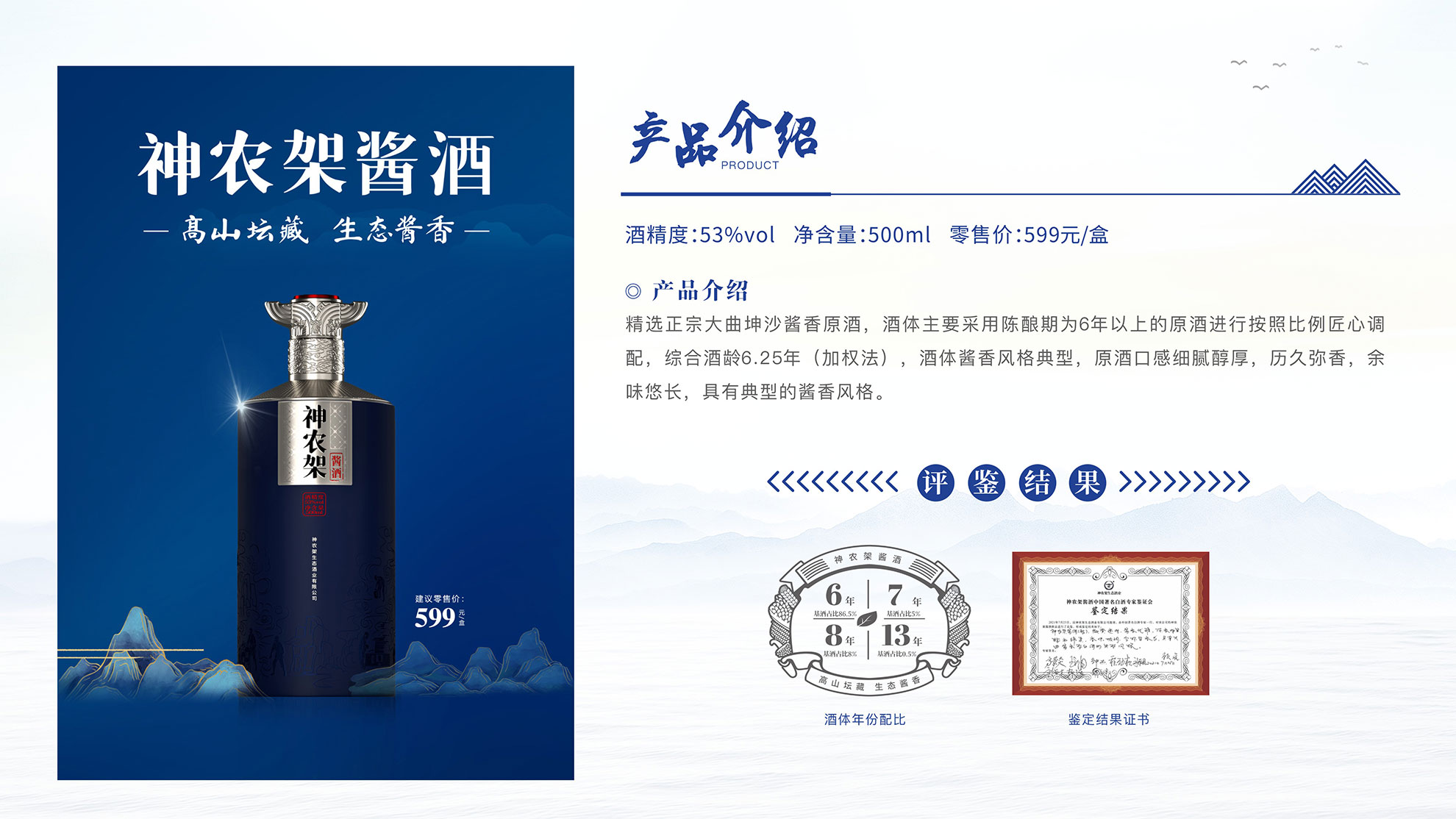 容 量:500ml 規 格:1*6/箱 酒精度:53度 香 型:醬香型 零售價:599元/盒 精選正宗大曲坤沙醬香原酒,酒體主要采用陳釀期為6年以上的原酒,輔以13年老酒 調味,按照科學配比匠心調配,加權真實年份6.25年。酒體醬香風格典型,原酒口感 細膩醇厚,歷久彌香,余味悠長。